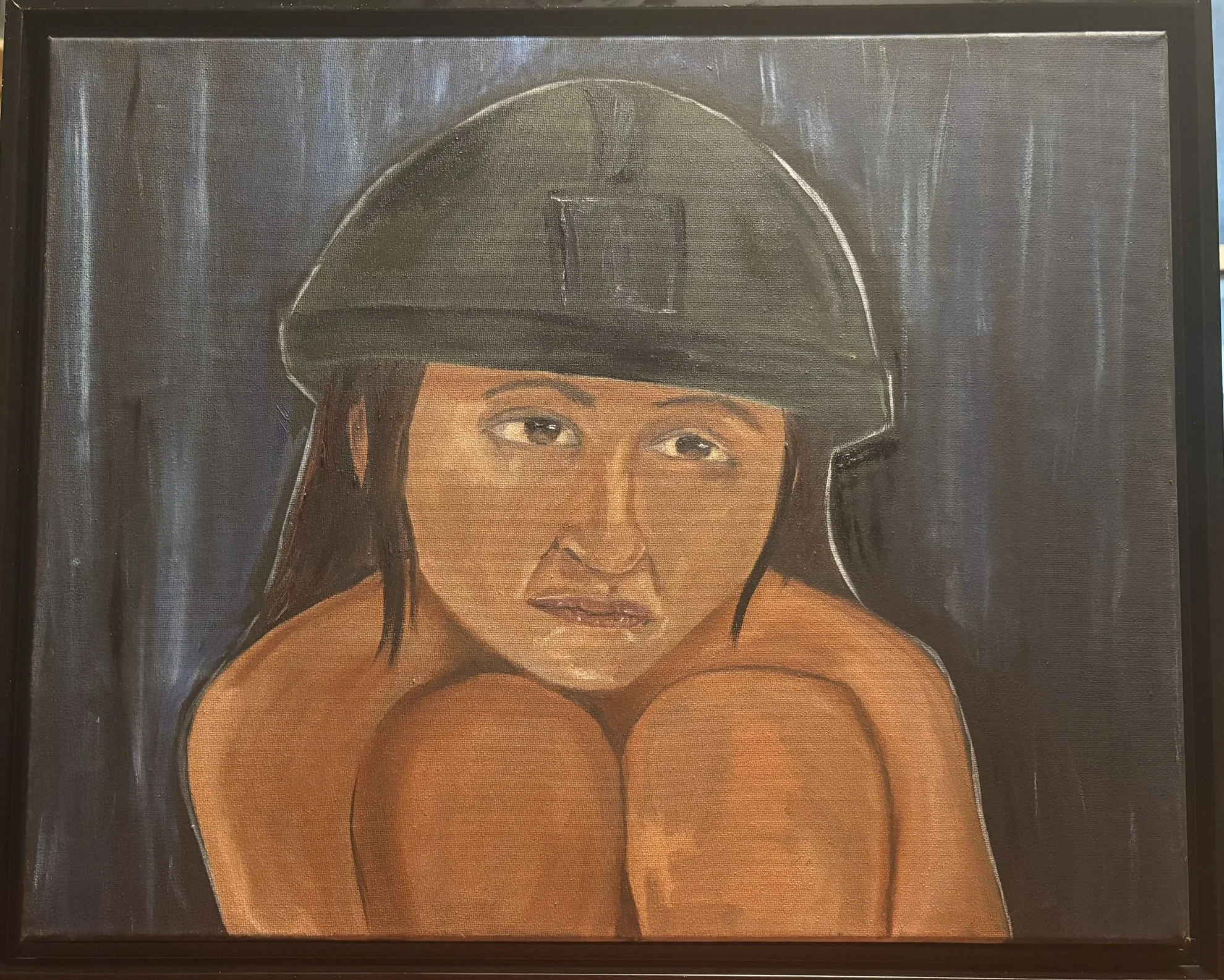 A stark military helmet—an object that feels jarringly out of place against their bare form. The contrast between the heavy, utilitarian helmet and the soft, exposed skin creates an immediate tension, evoking themes of trauma, innocence, and imposed resilience.