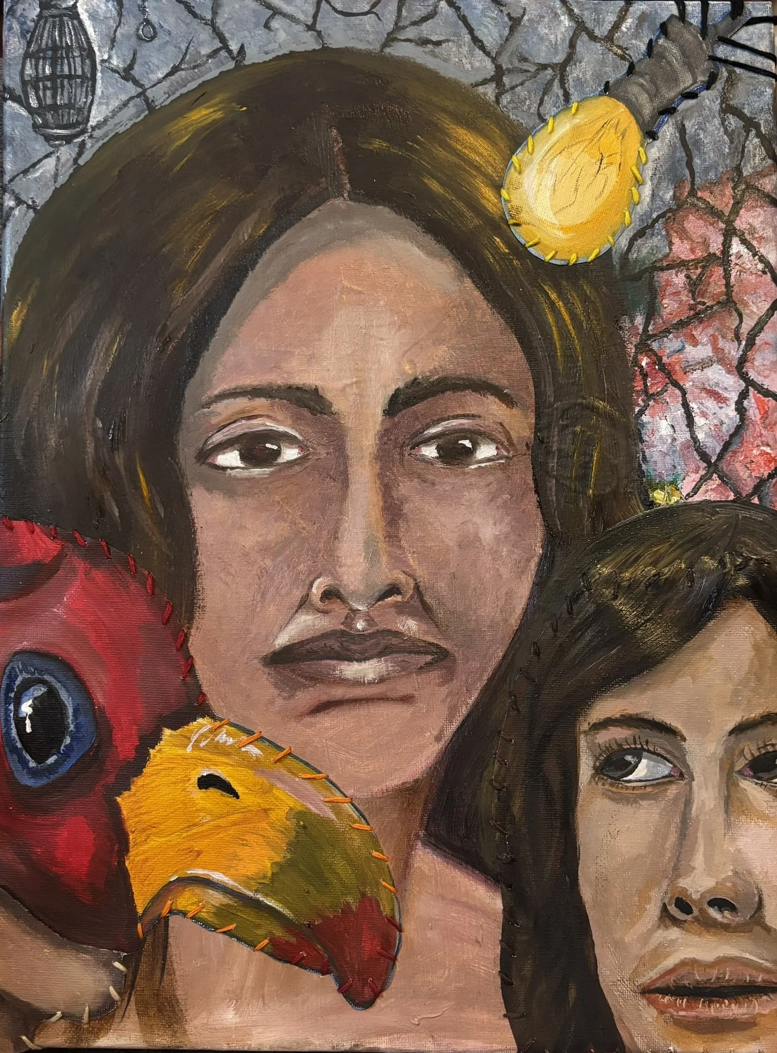 Merging multiple images together, gives this painting a pieced-together feeling, like memories or identities being sewn into one story.